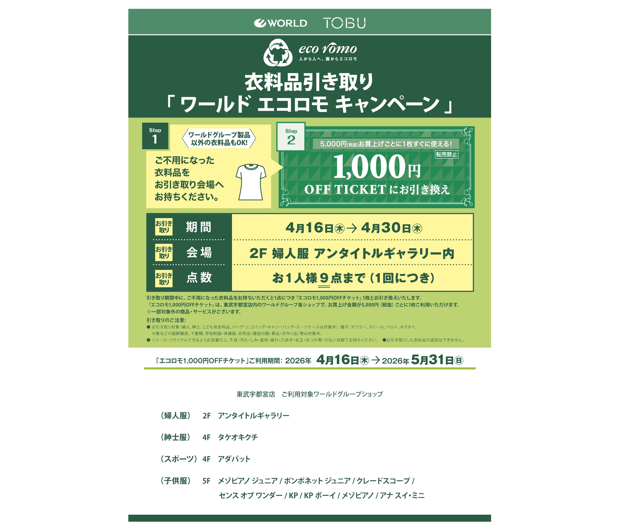 LADIES ITEM / LIVING&KIDS / MENS&SPORTS 2026.04.16[木] - 2026.04.30[木] ワールドエコロモキャンペーン