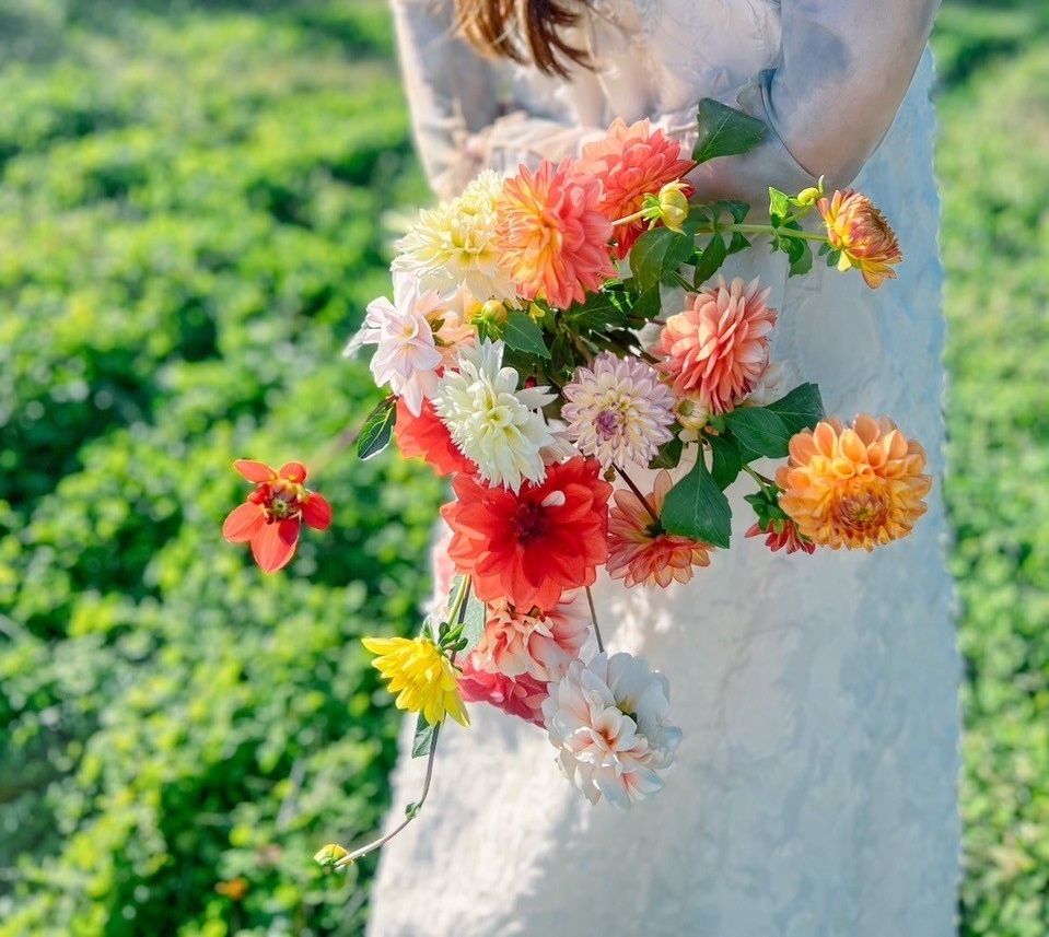 福島県塙町「THE DAHLIA」で咲く130品種・のべ15万本のダリアは、切花生産者が栽培過程にできた一般的には捨てられてしまう球根を譲っていただき、18,000m²の広大な敷地で大切に育てられました。