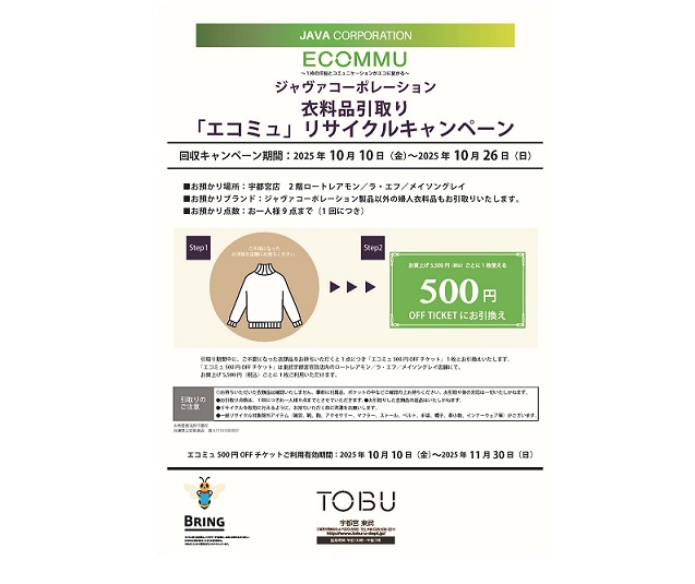 ご不要になった衣料品回収1点につき「エコミュ500円OFFチケット」1枚とお引換えいたします。