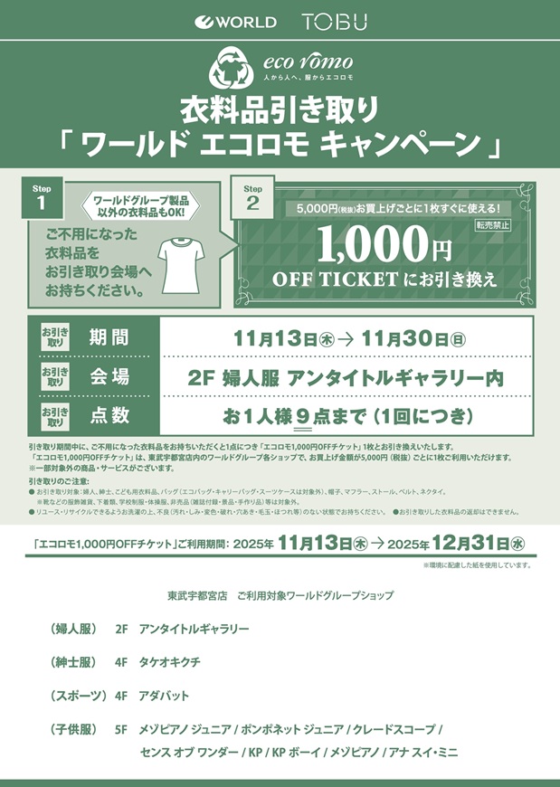 LADIES ITEM / LIVING&KIDS / MENS&SPORTS 2025.11.13[木] - 2025.11.30[日] <ワールド>エコロモキャンペーン 2F 婦人服 アンタイトルギャラリー内
