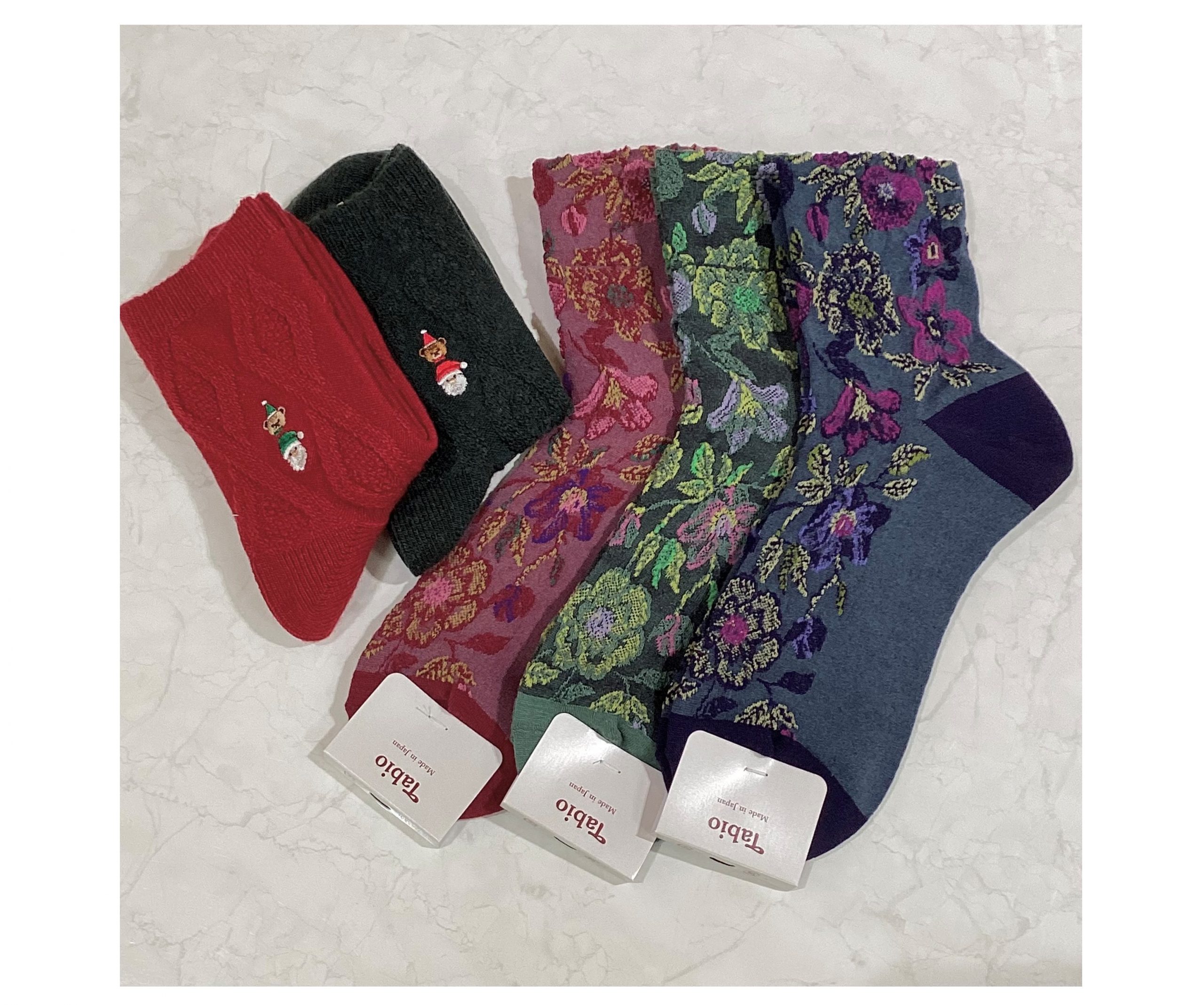 種類によって様々な色や形の花を咲かせるクリスマスローズを散りばめたウール素材の履き口ソフトなソックス。