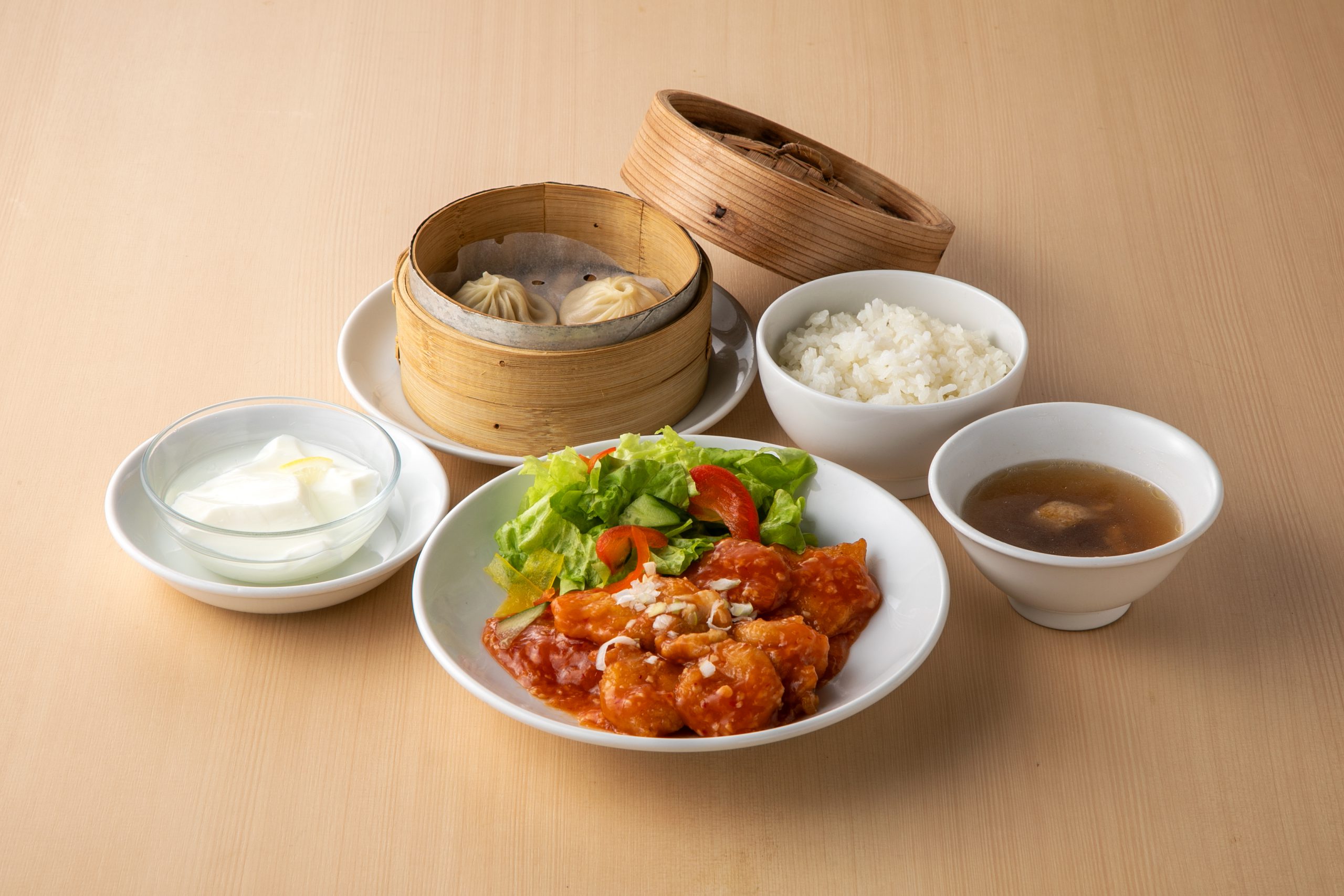 白身魚のカレイと海老とイカを豪華に使い、チリソースで和えました。