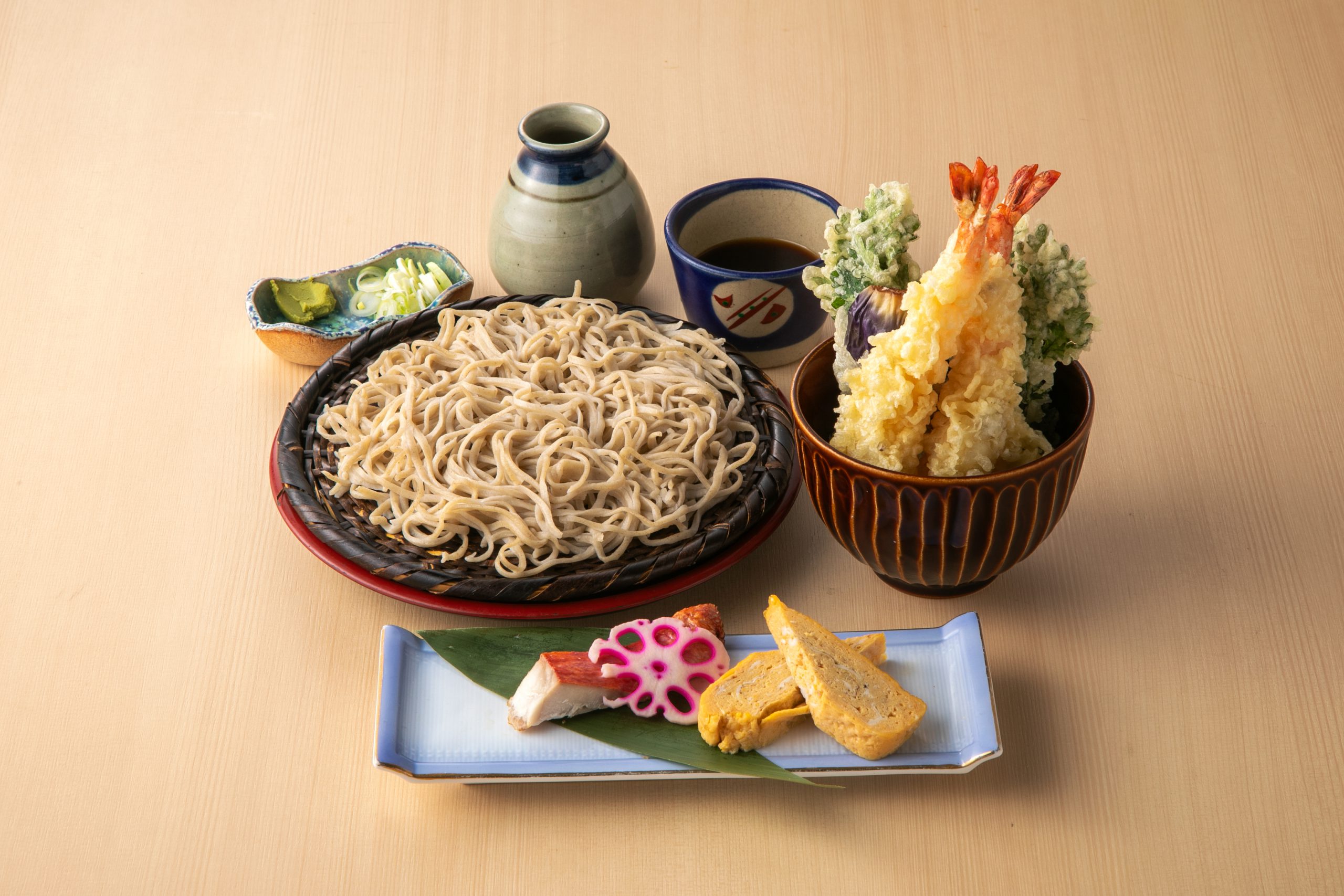 おそば100g(冷or温)・キンメダイの西京焼き・玉子焼き・ミニ海老天丼のセット。