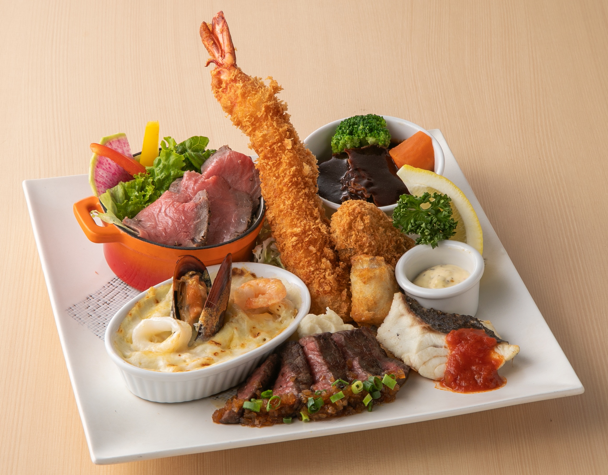 那須高原和牛のステーキ・銀座ローストビーフのサラダ・大海老フライなど
