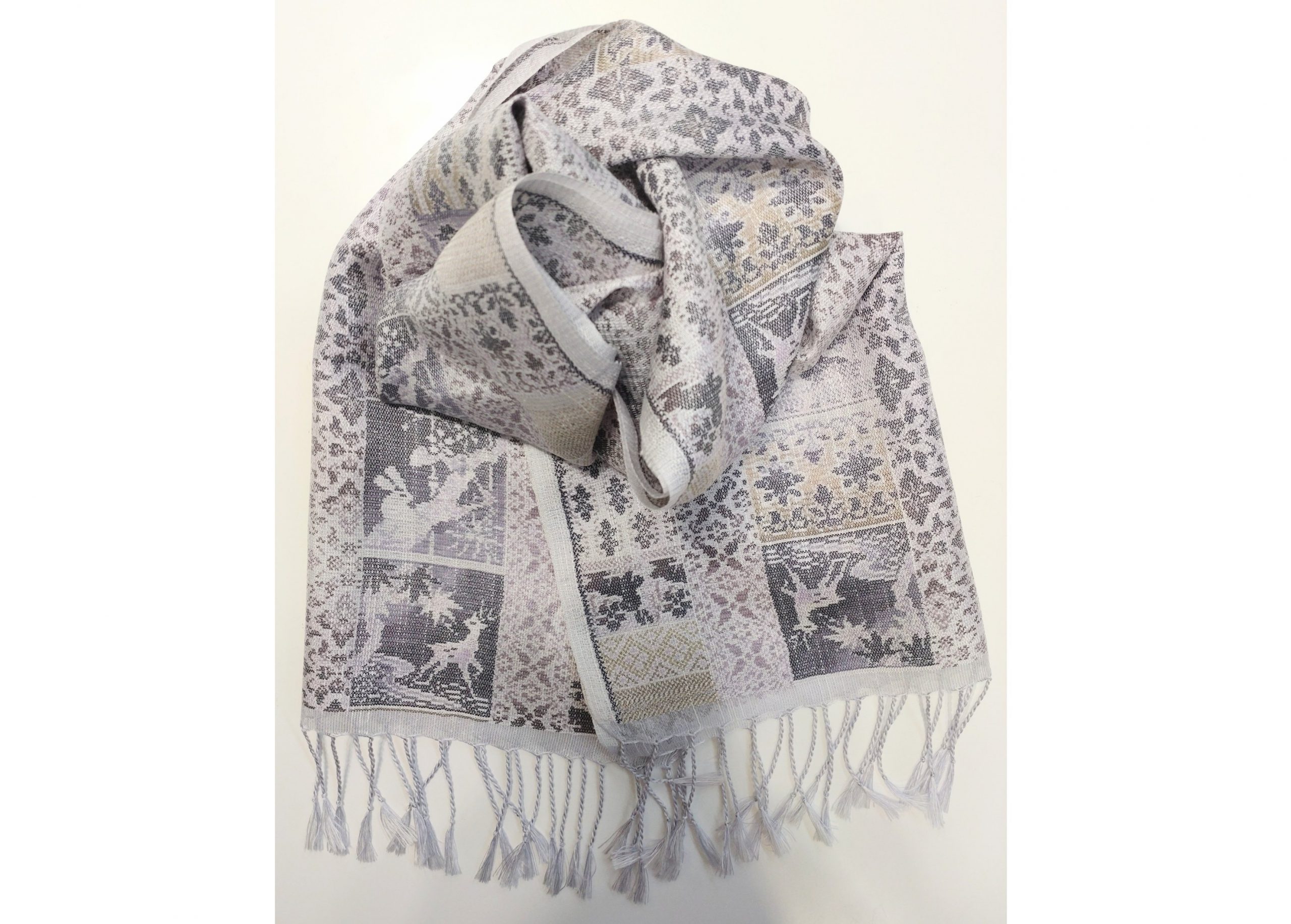 先染め糸を用いて柄を織り上げる大島の絣の技法を駆使した芸術作品ストール
