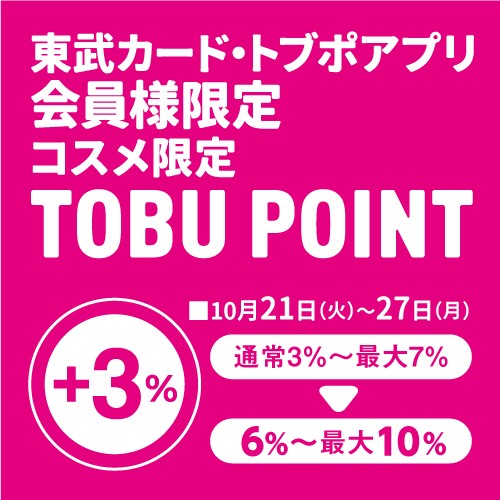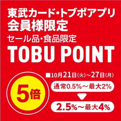 対象除外ショップ:4F ロイヤルサロン、商品券、各種金券、配送料、箱代、本、文具、金・銀・地金、ルイ・ヴィトン、ティファニー、シャネル・アルビオンほか化粧品の一部ブランド、学生服、好日山荘、5F のびっこ、6F 美と健康のフロア、7Fダイソー・スタンダードプロダクツ・スリーピー、8Fレストラン街「スパイス」、エステティックサロン ソシエ、アフタヌーンティー・ティールーム、カフェコムサ、タリーズコーヒー、秋田眞壁屋うどん、クスリのピノキオ、クリーニングフジドライ、リフォーム工房、クイックウォッシュ、外商・東武友の会・東武カードでの入金、その他当店が指定した商品