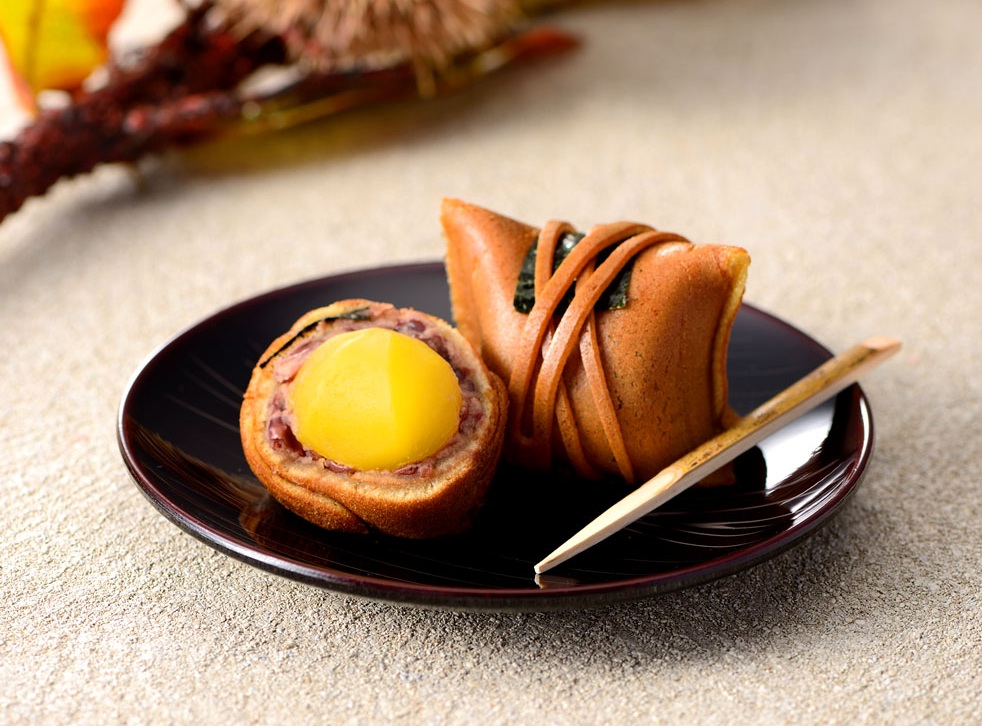 蜜漬けにした大粒の栗を丸ごと1つ使い、土壁を雪害から守る伝統的な風物詩「こも掛け」を表現した金沢銘菓。